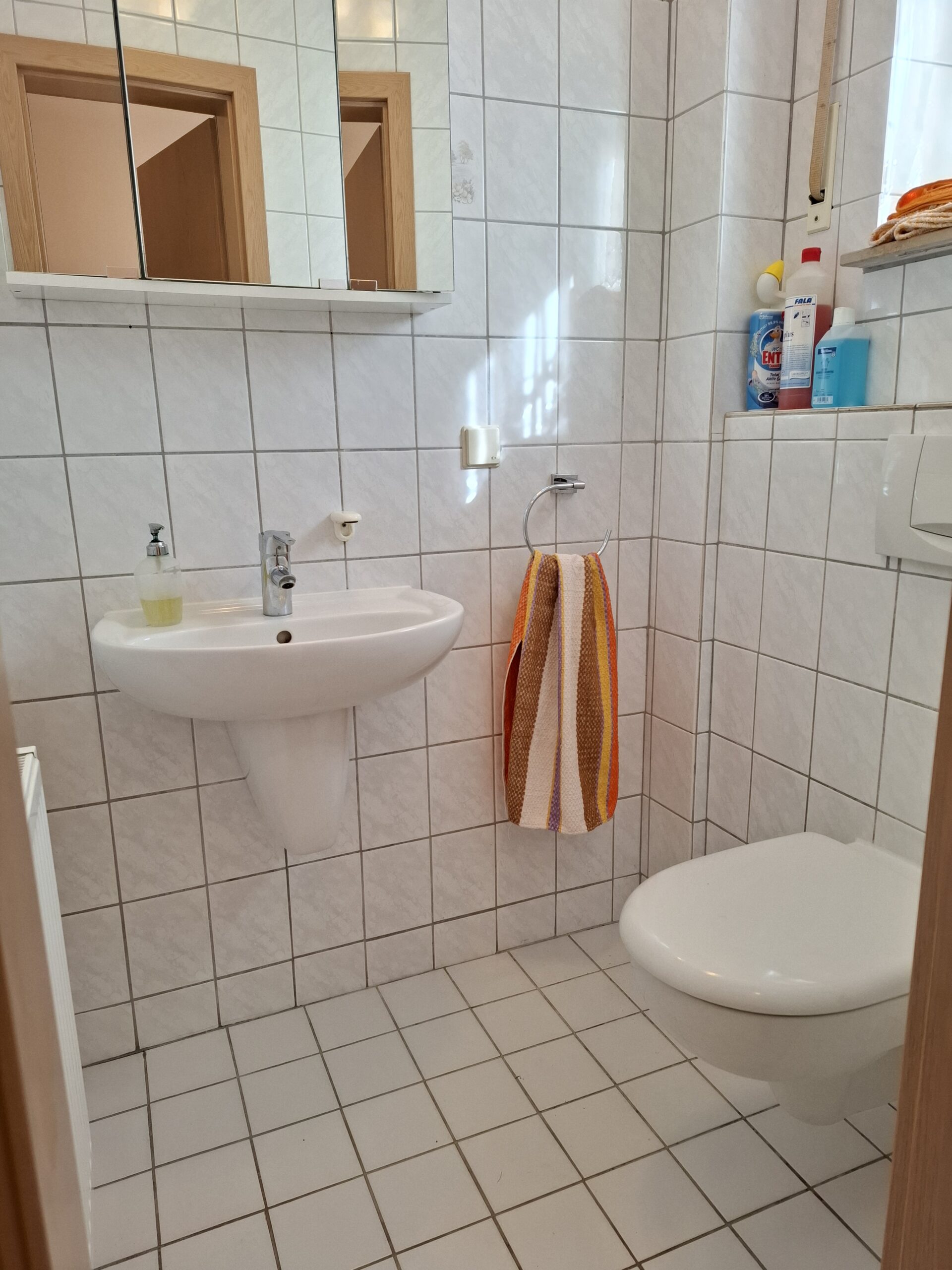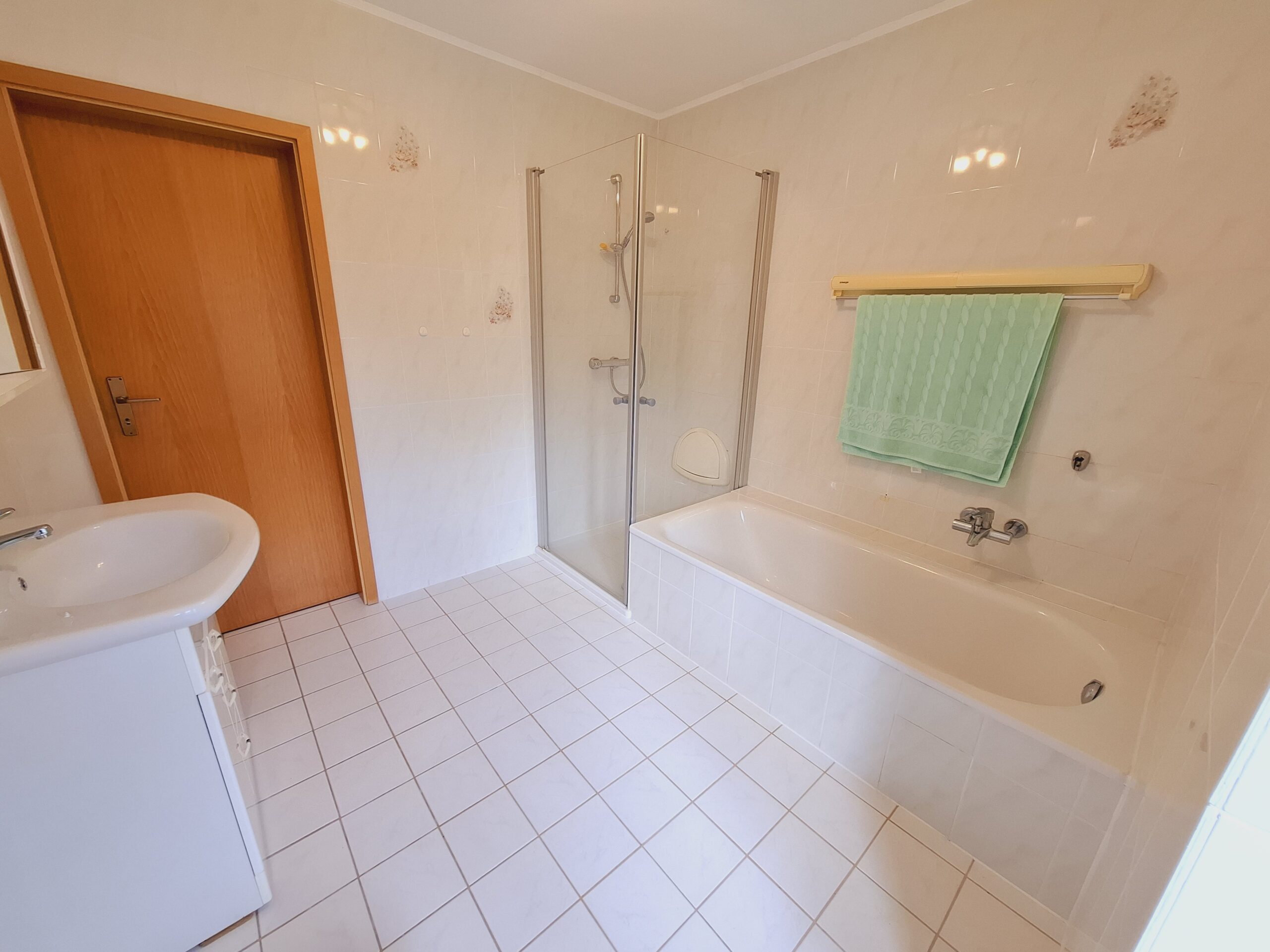 – Zeitloses, weiß gefliestes Vollbad mit Dusche & Badewanne